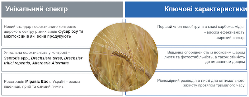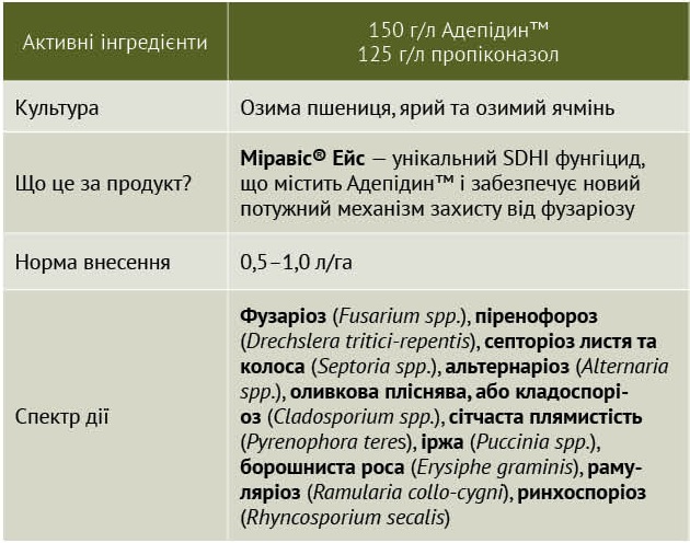 • Міравіс® Ейс — унікальний SDHI фунгіцид, що містить Адепідин™ і забезпечує новий потужний механізм захисту від фузаріозу;