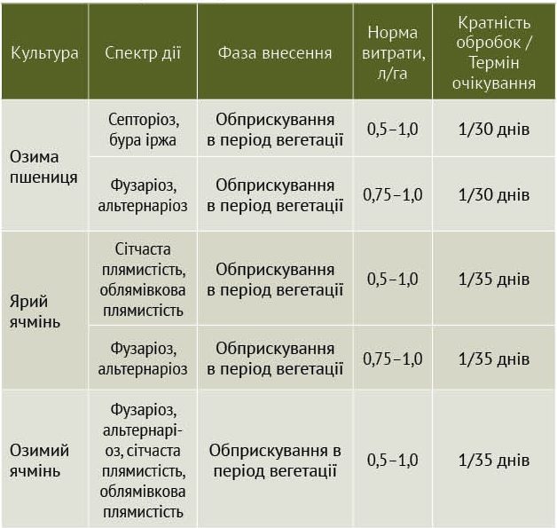 • найширший спектр захисту колоса й унікальна ефективність у контролі фузаріозів, альтернаріозу, плямистостей і септоріозів;