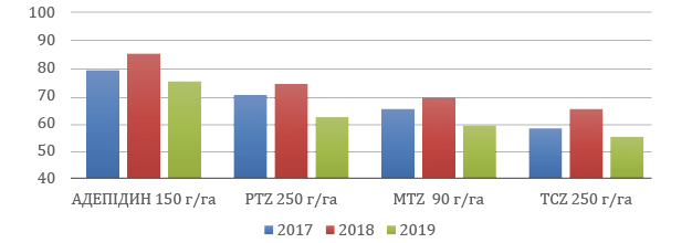 • діючі речовини мають різну ефективність у контролі фузаріозу (рис. 1) і різниця в ефективності становить від 20 до 40%, а найвищий рівень контролю спостерігається в Адепідин™ — 75–85%;