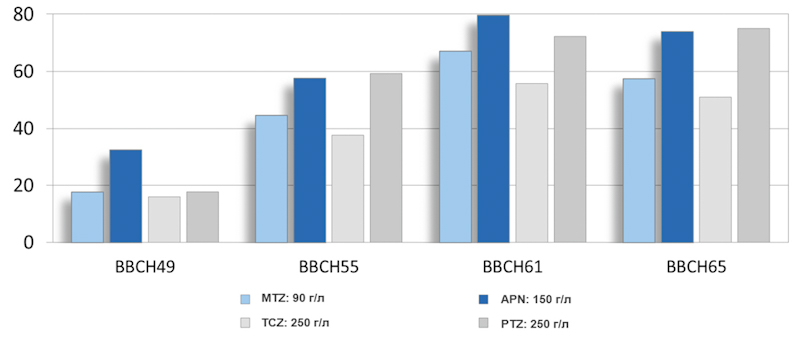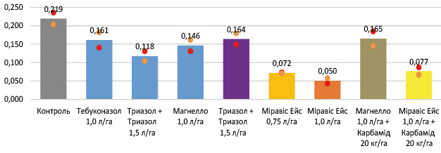 • як видно з рис. 2, найвищий рівень захисту виявлено за застосування фунгіцидів у фазу ВВСН 59–61 (початок цвітіння);