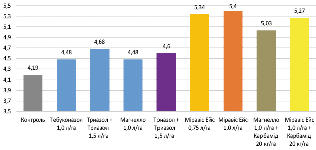 • збільшення врожайності (рис. 4), яку зафіксовано за застосування наявних на ринку препаратів, становить за внесення у Т3 (ВВСН 59–61) 3–4 ц/га, тим часом як за застосування Міравіс® Ейс урожайність збільшилась на 11–12 ц/га.