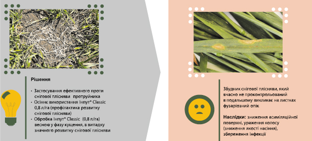 Патогенні гриби! На загущених, добре сформованих ранніх і середніх строків сівби посівах у більшій частині України спостерігаємо розвиток збудників борошнистої роси, септоріозу, плямистостей ячменю. Відповідно, рівень ураження становить до 5%, залежно від регіону та технології захисту й протруєння насіння. Також на полях зі слабким і недостатньо якісним протруєнням насіння спостерігається розвиток тифульозу (особливо на полях із великою кількістю рослинних решток) та снігової плісняви. Всьому причина — випадіння першого снігу на незамерзлу землю та зимові «вікна» з плюсовими температурами, висока вологість повітря за невисокої температури від +4 °С, які спровокували розвиток цих збудників хвороб. Що ж робити на полях, де маємо тифульоз та снігову плісняву? Як правило, снігова пліснява проявляється після танення снігу внаслідок ураження збудниками Microdochium nivale, Fusarium nivale. Вона визначається водянистими плямами з білим павутинним нальотом, який склеює листки культури. Уражені листки втрачають життєздатність і відмирають. Часто таке ураження призводить до пошкодження й відмирання вузла кущення культури та всієї кореневої системи, що спричиняє загибель усієї рослини. Однак проблемним є те, що конідіальне спороношення патогену лишається біля / на уражених частинах рослини. У роки з прохолодною весною вже від +5 °С збудник активно прогресує, тому дуже важко знайти відповідне рішення для його контролю в таких температурних умовах, оскільки основній масі фунгіцидних продуктів, що є на ринку, потрібно від +10 °С і вище для їх нормальної активності. Проте рання весняна обробка фунгіцидом Інпут® Classic у нормі від 0,8 л/га ранньою весною після відновлення вегетації дасть можливість проконтролювати цей збудник і уникнути подальшого розвитку фузаріозного опіку листя. Оскільки препарат проявляє активність уже від +5 °С і має тривалу захисну активність більш ніж 4 тижні, він паралельно вирішить питання й інших збудників хвороб — борошнистої роси та септоріозу.
