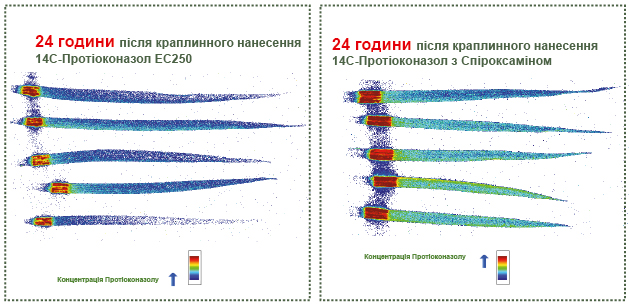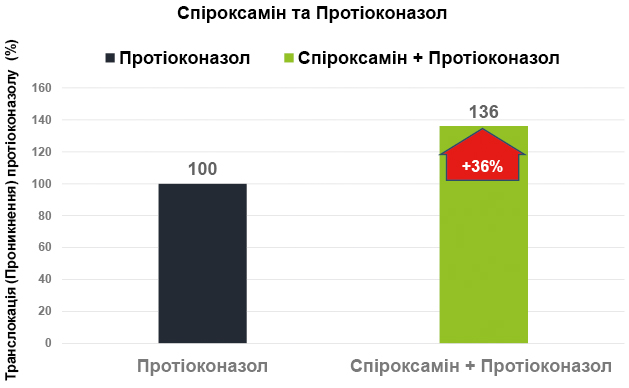 Довга затяжна й прохолодна весна з відновленням вегетації озимими культурами, яке спостерігалось уже в січні у деяких регіонах України. Розуміння того, коли прийде спекотна погода, буде напряму впливати на перший весняний догляд за посівами та визначатиме його терміни. Візьмімо кілька шляхів розвитку подій. Перший — весна справжня — довга та прохолодна. З достатньою кількістю вологи й помірними температурами. Обробка фунгіцидами проводиться залежно від ситуації з патогенами, але профілактично не пізніше як кінець кущення — початок виходу в трубку. Для такої обробки необхідні препарати, які надійно контролюватимуть борошнисту росу, особливо на загущених інтенсивних посівах із високим потенціалом урожайності, де вносили високі норми азотних добрив. Важливим є те, що ці препарати мають працювати вже від +5 °C, у портфоліо компанії «Байєр» — це Деларо® Форте, Каюніс®, Солігор®, Фалькон® та Інпут® Classic, які завдяки формуляції КЕ та наявності діючої речовини спіроксамін мають потужну активність контролю збудника. Логічним постає питання: чому ж так відбувається? Підтвердження тому — результати досліджень (рис. 3, 4), які демонструють пришвидшення транслокації Протіоконазолу у якісній КЕ формуляції продуктів від компанії «Байєр», яка діє на 30% швидше від стандартного або генеричного протіоконазолу, яким сьогодні вже переповнений ринок України. Така формула дозволяє швидко та якісно доставити активний компонент до патогену та локалізувати його негативний вплив шляхом різних механізмів дії на збудника. А швидкість виявлення відіграє важливе значення, особливо за потреби в лікувальній дії.