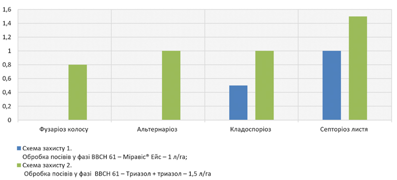 З огляду на дані обліків (рис. 1) можна відзначити, що на варіанті з Міравіс® Ейс відсутній прояв таких хвороб, як фузаріоз колосу та альтернаріоз, а також значно нижчий рівень ураження кладоспоріозом і септоріозом листя порівняно з конкурентним препаратом.