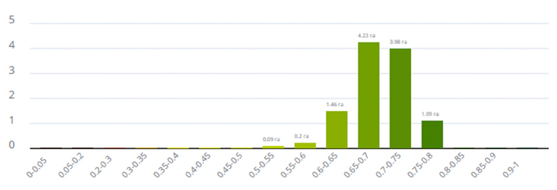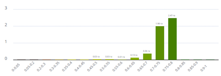 Також завдяки меншому поширенню хвороб на варіанті з Міравіс® Ейс спостерігається пряма залежність у кращому збереженні асиміляційної поверхні на пізніших етапах вегетації, що позитивно впливає на збільшення врожайності. Про це свідчать рис. 4 та 5, де індекс NDVI на варіанті з Міравіс® Ейс демонструє середній показник на рівні 0,77, а на конкурентній схемі — 0,71, що на 8 % менше порівняно з Міравіс® Ейс.