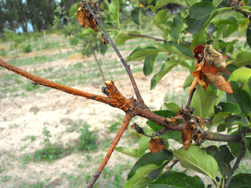 На початку розсування і відокремлення бутонів проти борошнистої роси та парші дерева обприскують одним із контактних фунгіцидів на основі діючих речовин: гідроксиду міді, в. г. (Косайд 2000, 2,5 кг/га; Патроль, зп; Блю Стар, зп, 1,5–2,0 кг/га; сульфату міді безводного + фосфористої кислоти (Блу Голд, 44% кс, 3,0 л/га).