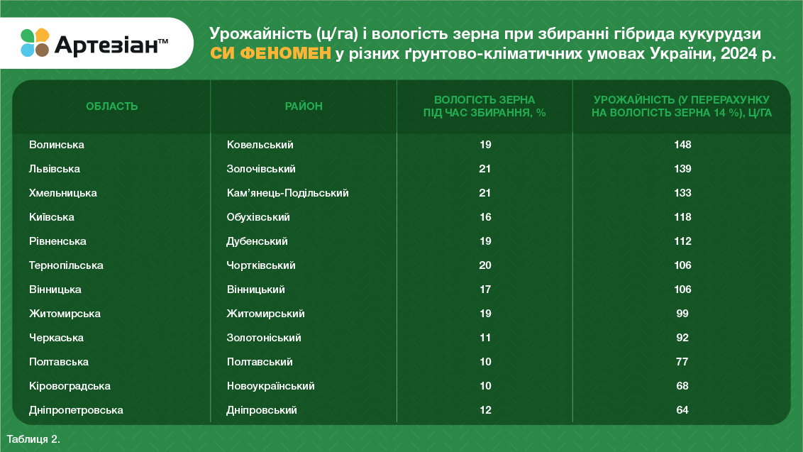 СИ Феномен характеризується високою стабільністю врожаю і швидким висиханням зерна за його дозрівання. З огляду на це його рекомендовано для вирощування в усіх ґрунтово-кліматичних умовах України. Такі характеристики сприяли підвищенню популярності цього гібрида протягом восьми років поспіль. Не став винятком і посушливий сезон-2024 (табл. 2).