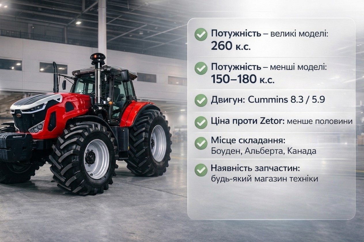 Вілсон: Велика модель — 260 кінських сил, двигун Cummins 8.3. Той самий що стояв у комбайнах у дев'яностих. Простий, дванадцяти клапанний, на механічній помпі. Кожен механік зустрічав його хоч раз у житті — жодних сюрпризів. Менша модель — двигун Cummins 5.9, від 150 до 180 кінських сил. Чудовий господарський трактор: годівля худоби, робота зі шнеком, преспідбирач, фронтальний навантажувач. Запчастини — буквально в будь-якому магазині