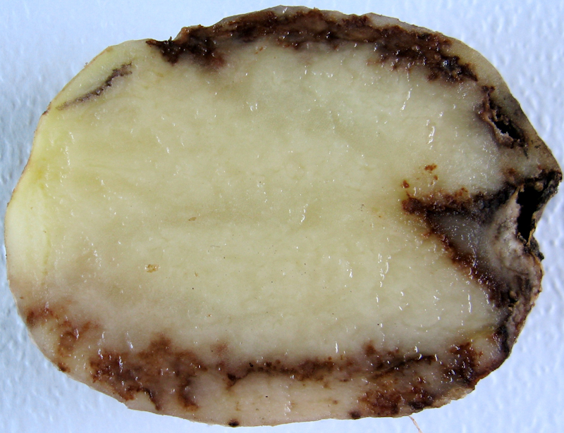 У період зберігання картоплі хвороба проявляється на бульбах також зі столонного кінця у вигляді вдавлених сухих світло-коричневих або темно-бурих плям, які покриті дрібними чорними склероціями, або у вигляді кільцевого некрозу. Уражена тканина стає горбистої, бурою, трухлявою. За насиченої вологи в сховищі вологості уражена частина бульби загниває, перетворюється в слизову кашкоподібну смердючу масу.