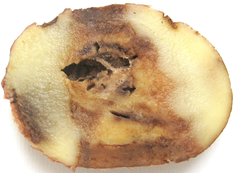 На бульбах картоплі хвороба виявляється у вигляді трохи вдавлених твердих бурих або свинцево-сірих плям різної форми. На розрізі бульб у місцях ураження спостерігається забарвлення паренхіми в бурий або іржаво-коричневий колір. Ураження поширюється в серцевину бульби у вигляді розпливчастих конусоподібних штрихів та смуг. Збудником хвороби є гриб Phytophthora infestans de Bary, який крім картоплі уражує томат, менше — перець і баклажани.