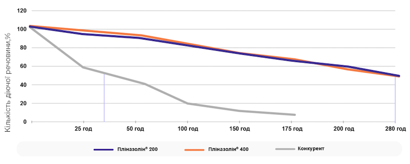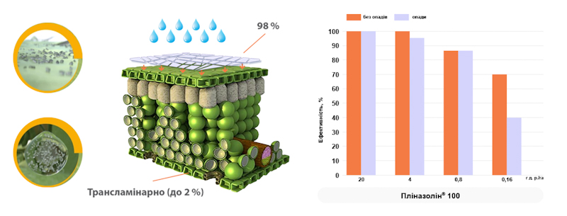 Ключові особливості Пліназоліну® — це його висока стійкість до дощу та ультрафіолетового випромінювання, що дає змогу збільшити інтервали між обробками й зменшити їх кількість. А це, своєю чергою, сприяє підвищенню продуктивності та якості урожаю.