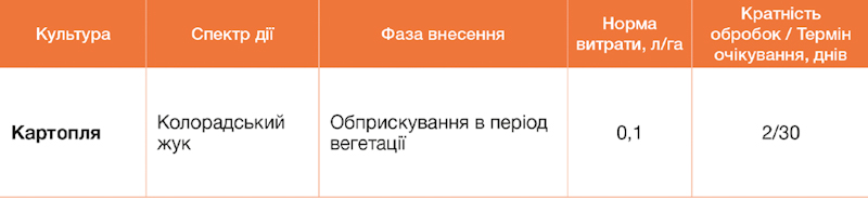 Згідно з офіційними регламентами, на посівах картоплі проти колорадського жука препарат слід застосовувати у нормі 0,1 л/га, що забезпечить надійний контроль як дорослих жуків, так і личинок. Важливо пам’ятати, що, оскільки картопля може формувати досить потужну вегетативну масу, для досягнення максимальної ефективності необхідно забезпечити рівномірне покриття усіх ярусів рослин захисним шаром препарату. Саме тому рекомендована норма витрати робочого розчину має становити 200–400 л/га.