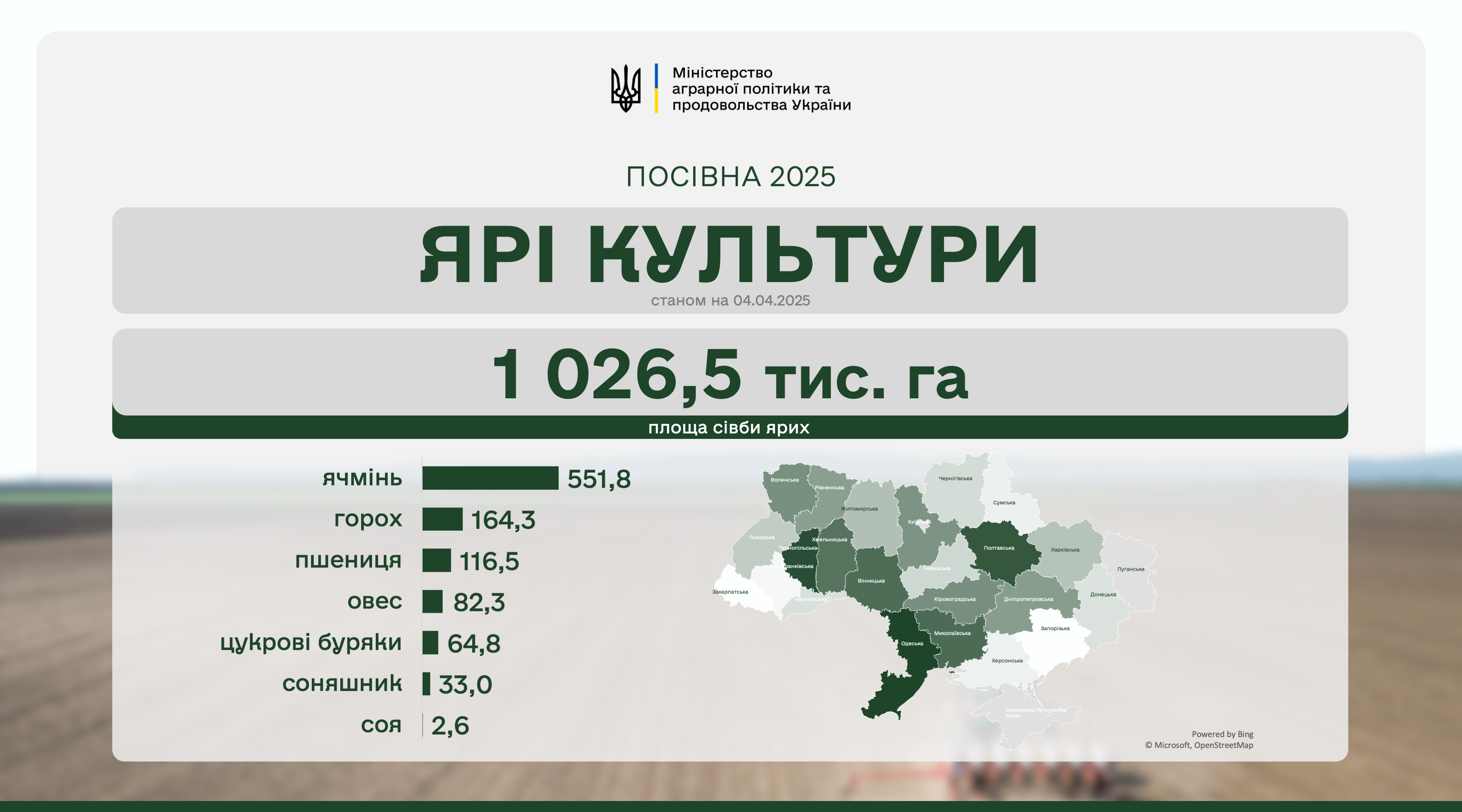Станом на 4 квітня 2025 року аграрії всіх областей України засіяли 926 тис. га ярих зернових та зернобобових культур. Також аграрії розпочали сівбу соняшнику.