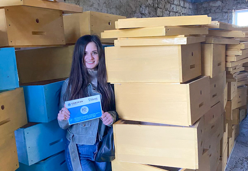 Анастасія Конюша, співвласниця пасіки в Черкаській області, за рахунок гранту від міжнародної науково-дослідницької компанії Corteva Agriscience, отриманого в рамках освітньо-грантової програми TalentA, розширила виробництво меду за рахунок закупівлі 60 багатокорпусних вуликів та бджолосімей, а також організувала навчання бджільницькій справі майже 20 початківців, які були змушені переселитися в Черкаську область через війну.