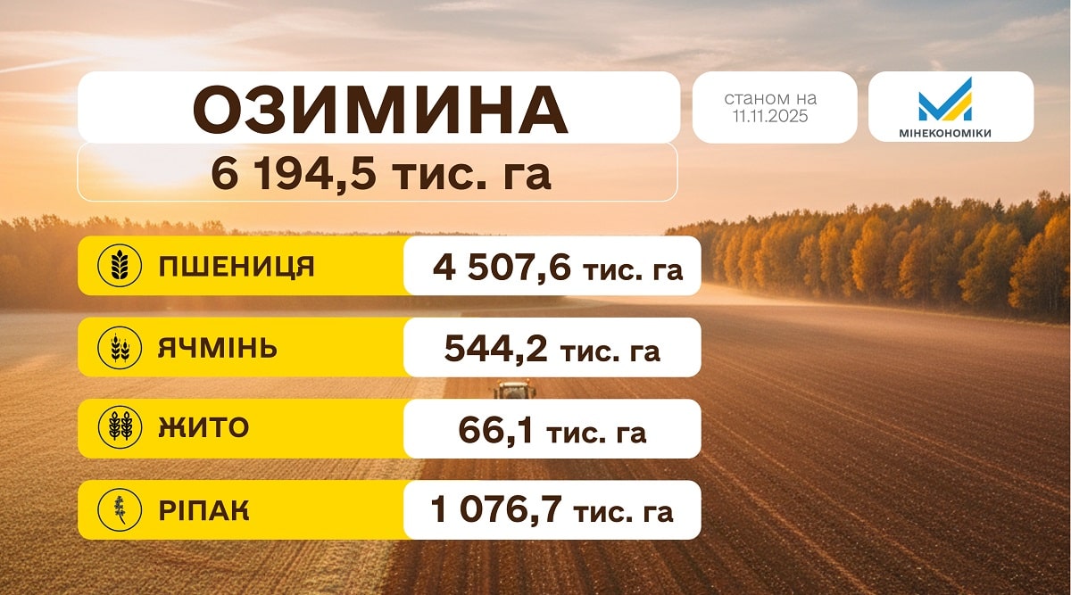 Станом на 11 листопада українські аграрії засіяли 6 194,5 тис. га озимих культур. Це 94,5 % від прогнозованих площ.