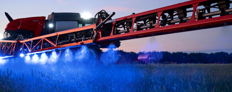 Головна проблема нічного внесення – обмежена видимість. Штатне освітлення непогане, але звернімо увагу на штангу обприскувача. Які тут є нюанси? Форсунки, які встановлено на штанзі, для ефективної роботи час від часу слід візуально контролювати, особливо коли стоїть система з ШИМ-соленоїдами. Також важливо слідкувати за габаритами штанги на розворотах та межах поля. Ми пропонуємо комплект з двох ліхтарів зі спеціальним синім діапазоном освітлення, силою потоку в 30 000 кандел і дальністю освітлення до 150 метрів. Вони освітлюють факели розпилу і площу навколо штанги. Додаємо комплект монтажу: дроти, блок з реле-вимикачем та кронштейни. Ліхтарі мають три роки гарантії та повністю відповідають вимогам пило/волого захисту IP68, IP6K9K. Чому синє світло? Фізичні властивості променю з довжиною хвилі 475 нанометрів дозволяють дуже добре бачити контури факелів розприскування і забезпечують ефект не тільки вночі, а й у вечірній час доби та навіть в похмурий день. З цими ліхтарями Ви зможете постійно слідкувати за роботою форсунок і попередити пропускання внесення. Не менш важливим є те, що зменшується втомлюваність оператора, тому можливий рух з більшою швидкістю.