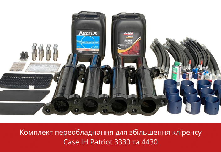– Штатний кліренс обприскувача CASE IH PATRIOT – 135 сантиметрів. І для більшості операцій його достатньо на період весняно-польових робіт. Якщо Ви потребуєте обприскувач для десикації соняшнику чи обробітку високорослих культур, ми можемо збільшити кліренс на 40, 50 або 60 см. Комплект складається з 4-х стойок, втулок для монтажу, кріплення, шлангів і додаткової сходинки для оператора. В чому перевага? Ми пропонуємо на 100% імпортні комплектуючі. Це оригінальна продукція з високою якістю, міцністю та надійністю, яка виключає проблеми в процесі монтажу та експлуатації. Також в комплекті дві каністри гідравлічної рідини, щоб компенсувати втрати при подовженні шлангів гідроходу.