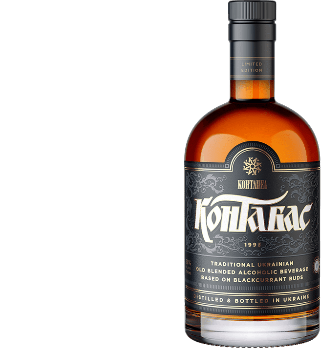 Контабас - це стародавній український напій, що виготовляється на основі спеціально підготовленого дистиляту та витримується у скляних кубах на свіжозрізаних бруньках чорної смородини.