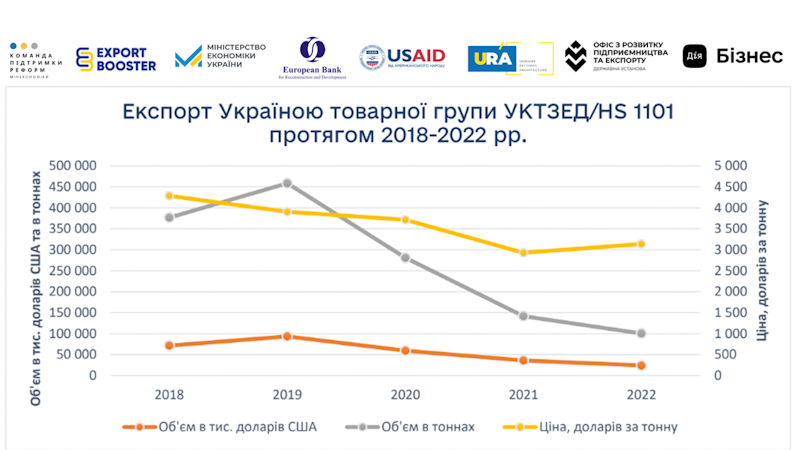 З 2019 року обсяг експорту борошна в Україні скоротився у 4,8 разів – з 365 тис. т у 2019 році до 76 тис. т у 2022 році. Проте, Україна стала другою за об’ємом країною-постачальником борошна в ЄС.