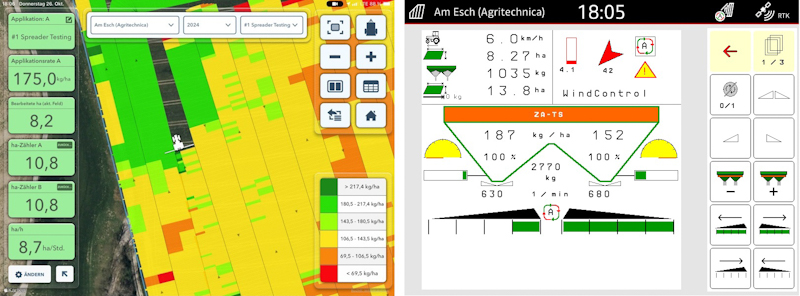 Amazone ZG-TS оснащений WindControl (ліворуч) і FieldView Cab App, що візуалізує дані, отримані з датчика
