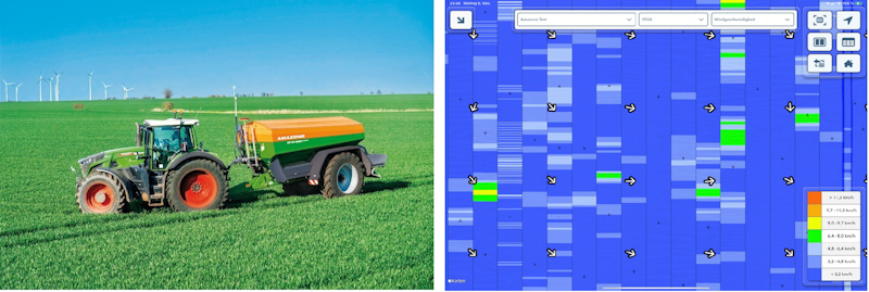 Швидкість візуалізації FieldView Cab App (ліворуч), застосована Amazone ZA-TS і відображена на AmaTron4 (праворуч)