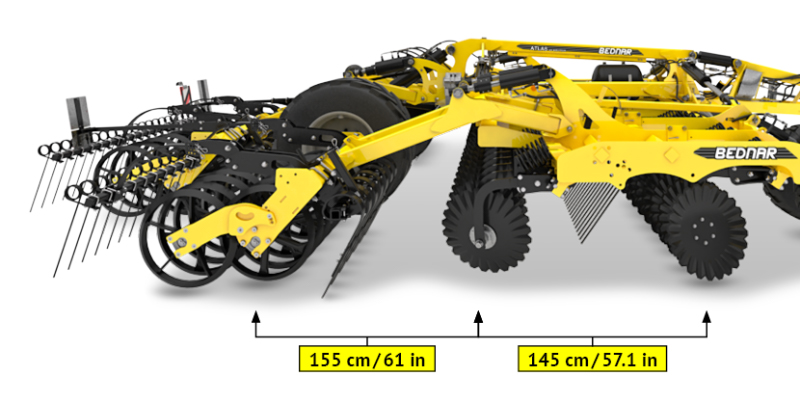 Передній і задній ряди дискової секції розташовані на відстані більше ніж 145 см один від одного, а відстань від дисків до задньої осі котка складає 155 см