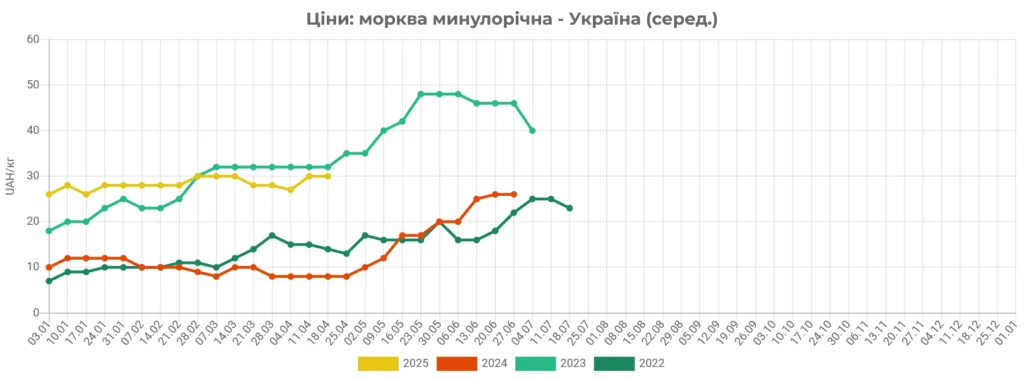 Варто зазначити, що на сьогоднішній день морква в Україні вже надходить у продаж у середньому в 4,5 рази дорожче, ніж за аналогічний період минулого року.