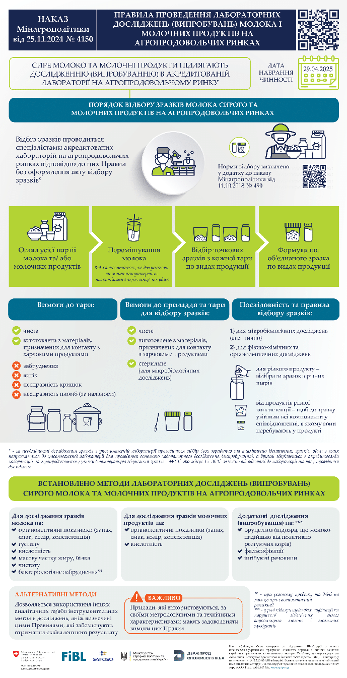 Спільно з Мінагрополітикою та швейцарсько-українською програмою «Розвиток торгівлі з вищою доданою вартістю в органічному та молочному секторах України», що впроваджується Дослідним інститутом органічного сільського господарства (FiBL, Швейцарія) у партнерстві із SAFOSO AG (Швейцарія), підготували інформаційні матеріали щодо Правил проведення лабораторних досліджень молока та молочних продуктів.