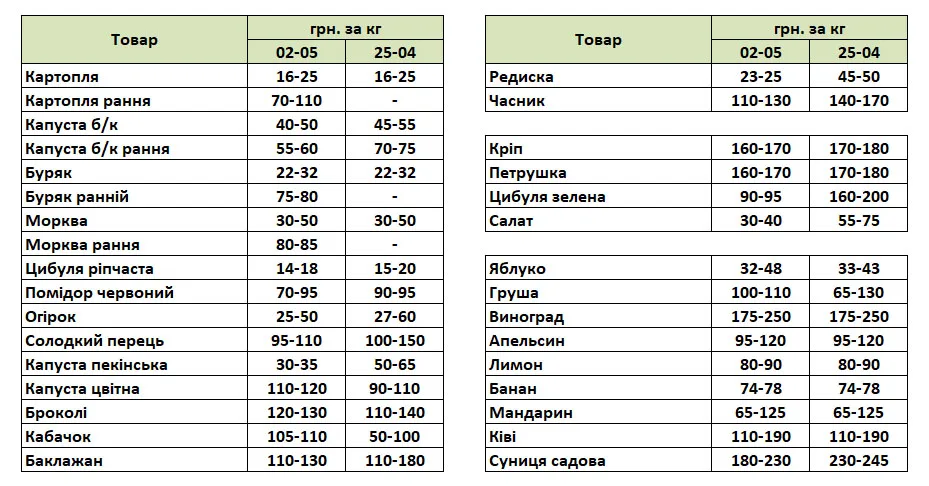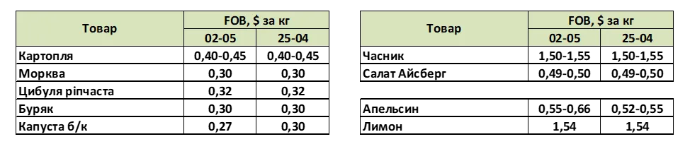 А торік у цей же час лідером продажу торгового майданчика була білокачанна капуста, але її пропозиція, як і інших овочів «борщового кошика», зменшувалася. На півдні Казахстану стартував продаж салату Айсберг. Знову активізувались українські продавці спаржі. Пропозиція суниці садової зростала, причому в Україні вона коштувала дешевше, а в Узбекистані дорожче, ніж сьогодні. З’явилися перші пропозиції щодо продажу ягоди з Азербайджану. В Узбекистані розпочали збирання абрикосу, а Єгипет почав пропонувати на експорт виноград нового врожаю.