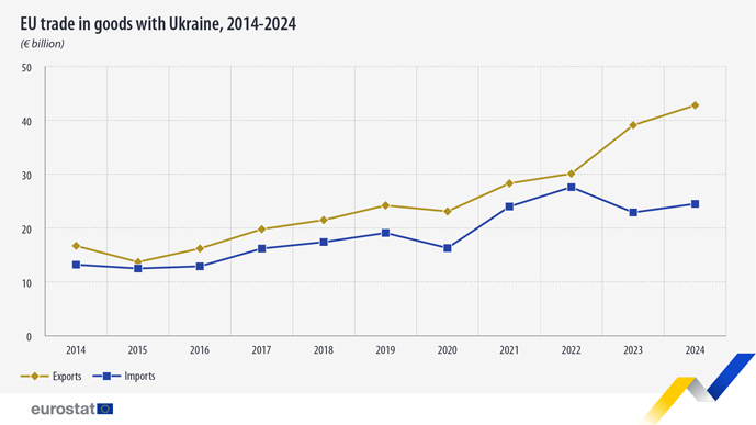 Європейський Союз 2024 року експортував до України товарів на суму €42,8 млрд, а імпортував на €24,5 млрд, це більше попереднього року на 9,4% і 7% відповідно.
