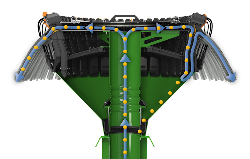 Завдяки великій розподільній головці та конфігурації Smart plus забезпечується точна задана норма висіву в кожному рядку . Індивідуальне автоматичне відключення рядків підвищує ефективність та зменшує перевитрати насіння і добрив на краях поля та клиноподібних ділянках. Керування технологічною колією доступне у симетричному, асиметричному або гнучкому варіантах і легко задається через ISOBUS-термінал. Відключення окремих рядків — особливо корисне, наприклад, при сівбі ріпаку з подвоєною міжрядною відстанню.