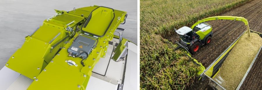 Концепція розвантажувального жолоба також оновлена: простою заміною кінцевого елемента можна оптимізувати його довжину для відповідного навісного обладнання для збирання трави чи кукурудзи. Для збирання кукурудзи з ORBIS 10500 та максимальної довжини розвантажувального жолоба кінцевий елемент може бути гідравлічно складений для безпечного транспортування.