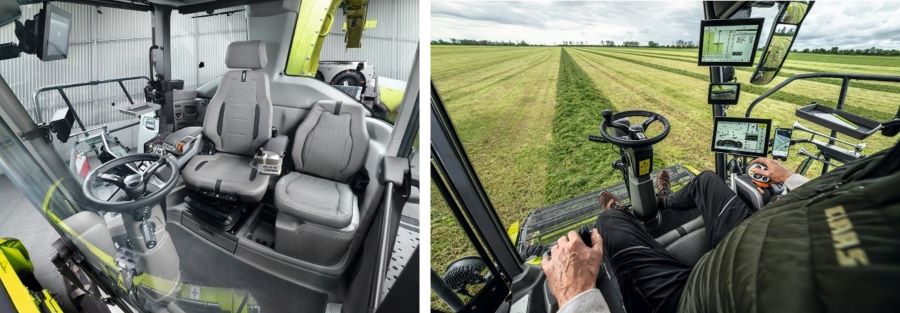 Оператори, які працювали з комбайнами JAGUAR та іншою технікою CLAAS, одразу відчують себе як вдома у просторій кабіні. Керування кабіною здійснюється за допомогою звичних елементів: важеля CMOTION у консолі правого підлокітника для контролю швидкості руху, а також вбудованого 12-дюймового терміналу CEBIS. Система GPS PILOT CEMIS 1200 доступна для супутникового керування та виконання завдань точного землеробства, таких як управління парком машин, замовленнями та ведення документації. Різноманітні варіанти сидінь, включаючи шкіряне поворотне сидіння (з підігрівом та вентиляцією), автоматичний кондиціонер та надзвичайно низький рівень шуму в кабіні забезпечують максимальний комфорт і роботу без втоми. Інноваційні системи очищення, як-от преміальна система склоочисників, гарантують ідеальну видимість навіть у найскладніших умовах збирання врожаю.