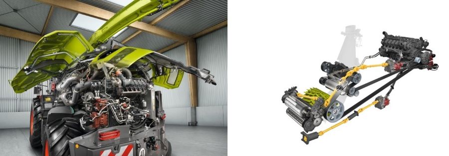 З 1994 року поперечно розташовані двигуни в комбайнах JAGUAR безпосередньо приводять у рух ножовий барабан та інші агрегати, що забезпечує надзвичайно низькі втрати потужності. У JAGUAR 1000 також клинопасовий привод відбирає потужність безпосередньо від колінчастого вала 24-літрового V12-двигуна MAN і передає її на подрібнювальний барабан, прискорювач викидання, а звідти – на кукурудзяну дробарку. Для ходового приводу, вальців попереднього ущільнення та двох незалежних варіативних приводів навісного обладнання ззаду, ліворуч від двигуна, розташована гідророзподільна коробка, яка приводить у дію гідромотори. Завдяки незалежним варіативним приводам навісного обладнання, швидкість підбирача та забірного шнека на PICK UP, а також різальних і транспортних дисків та подавальних барабанів на ORBIS можна регулювати незалежно один від одного, адаптуючи її до умов збирання врожаю.