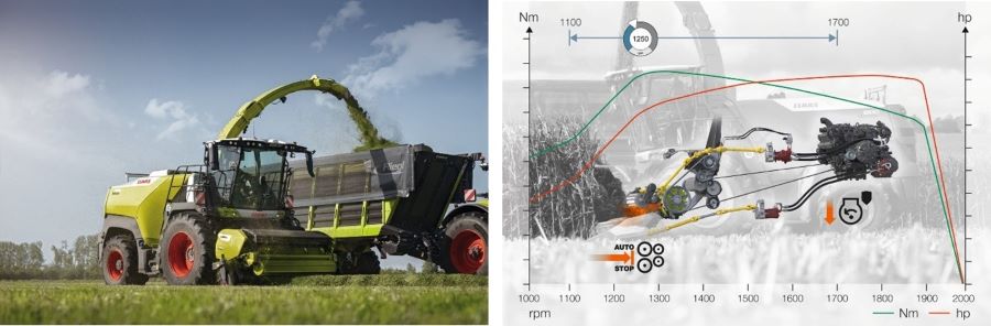 JAGUAR 1000 стандартно оснащений системами CEMOS AUTO CROP FLOW та CEMOS AUTO PERFORMANCE, що забезпечують постійну оптимальну ефективність роботи, максимально полегшуючи працю оператора. Система керування двигуном і приводом CEMOS AUTO PERFORMANCE допомагає оператору, підтримуючи постійну або максимальну пропускну здатність протягом усього збирання. Вона адаптує швидкість руху відповідно до навантаження на двигун і, за потреби, автоматично регулює його потужність, наприклад, при низькій врожайності. Це дозволяє JAGUAR 1000 завжди працювати в оптимальному діапазоні потужності, що знижує витрату палива. CEMOS AUTO CROP FLOW постійно, інтелектуально та автоматично відстежує оберти двигуна, щоб забезпечити безперебійну роботу комбайна. Вона зупиняє потік рослинної маси, якщо оберти двигуна падають нижче встановленого мінімального значення.