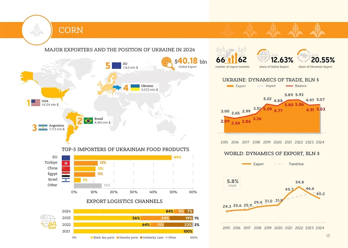 Експорт української кукурудзи склав $5,07 млрд, що становить 12,6% від світового експорту та 20,5% від загального аграрного експорту України.