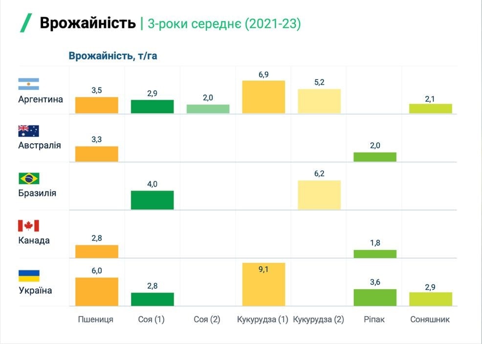 Попри різні умови, країни стикаються з подібними викликами — логістика, нестача кадрів і зміни клімату. Україна демонструє одні з найвищих показників врожайності: 6 т/га пшениці, 9,1 т/га кукурудзи, 2,9 т/га соняшнику та 3,6 т/га ріпаку. Врожайність по цих культурах перевищує показники Аргентини (пшениця — 3,5 т/га, кукурудза — 6,9 т/га, соняшник — 2,1 т/га), Бразилії (кукурудза — 6,2 т/га), Канади (пшениця, — 2,8 т/га, ріпак — 1,8 т/га) та Австралії (пшениця — 3,3 т/га, ріпак — 2 т/га).