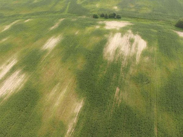 На рис. 4 показане поле сої з дерново-підзолистими кислими грунтами, що мають низький уміст рухомих сполук калію, кальцію і магнію, але містять високий вміст водню та алюмінію та до середньої кількості доступного фосфору. Грунти характеризуються вкрай несприятливими фізичними властивостями і поживним режимом. Це пухка, незв'язна маса піску, яка розпадається на окремі механічні елементи, а тому повністю позбавлена структури. При цьому водопроникність їх висока, а вологоємність - низька. Атмосферні опади в них не затримуються, вони легко просочуються вниз, грунт швидко висихає до стану критичної вологості, внаслідок чого він не може створити необхідний для рослин запас продуктивної вологи. На фотографії видно пожовтіння країв листової пластинки сої. Це типовий недолік калію у ґрунті. При чому спостерігається крайній ступінь нестачі калію в ґрунті, що суттєво відбивається на зменшенні врожайності.