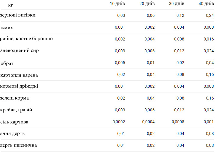 Харчовий раціон каченят в таблиці.
