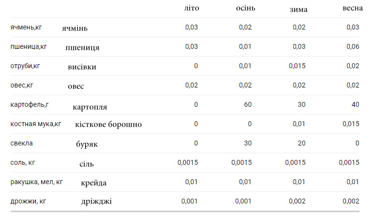 Харчовий раціон дорослої особини за порами року представлений в таблиці нижче.
