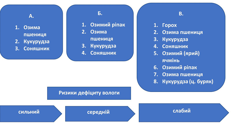 Про можливі ризики дефіциту вологи в залежності від характеру сівозміни, її насичення культурами з різною потребою у воді, розвитком кореневої системи, довжиною вегетаційного періоду можливо скласти уявлення проаналізувавши приведені нижче приклади сівозмін (мал.1). Розширення сівозміни до 5-8полів, в якій чергуються культури з глибокою кореневою системою, тривалим вегетаційним періодом та культурами з мілкою кореневою системою, короткою вегетацією (варіанти Б, В), порівняно з короткоротаційною (вар.А) сприятиме більш стабільному вологозабезпеченню рослин, а відтак стабізізації продуктивності всіх культур сівозміни.