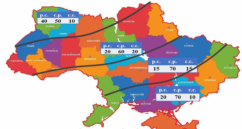 Загальновідома, що більш стабільні результати урожайності кукурудзи отримують у тих господарствах, які висівають кілька гібридів різних груп стиглості з врахуванням ґрунтово-кліматичних умов зони, удобрення а також стартових запасів продуктивної вологи в грунті. Орієнтовне співвідношення груп стиглості гібридів кукурудзи представлене на мал. 2. Приведені дані свідчать про те, що основу структури (50-70%) у посівах усіх ґрунтово-кліматичних зон мають складати середньоранні гібриди кукурудзи.