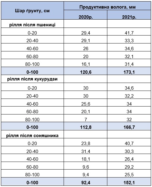 За об’ємами водоспоживання культури умовно можливо розмістити в наступному порядку : цукровий буряк > соняшник > соя кукурудза > озима пшениця > озимий ріпак > горох > озимий ячмінь >ярий ячмінь > однорічні трави. Підтвердженням даного положення слугують як дані літератури, практики а також наші власні спостереження проведені на агроплатформі Лімагрейн у Вінницькому районі Вінницької області (табл.1). Так, ранньою весною найнижчими запасами продуктивної вологи в метровому шарі ґрунту характеризувалася рілля після соняшника. Порівняно з ріллею, яка була після озимої пшениці в сухому 2020р. її було менше на 28,2мм , порівняно з ріллею після кукурудзи – на 20,4мм. Схожа ситуація спостерігалася і більш вологому 2021р. Варто відмітити, що в сухі роки (2020р.) після соняшника запаси продуктивної вологи глибше 60 см були практично відсутні.