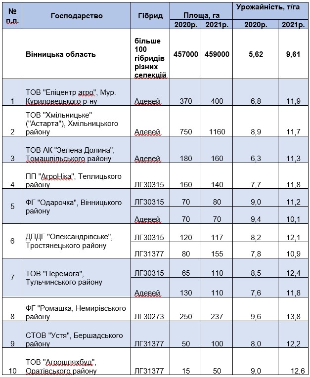 Табл. 2. Урожайність гібридів кукурудзи, бренду «Hydraneo» в господарствах Вінницької області