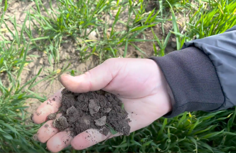 Володимир демонструє поля, показує стан ґрунту. Пшениця була посіяна на полі, на якому вже 4 роки не ореться. «В цьому процесі немає потреби» – стверджує господар. Структура ґрунту пухка, відчувається наявність вологи, що можна побачити на фото. ЯРОСу було внесено з розрахунку 11 л на 1 га.