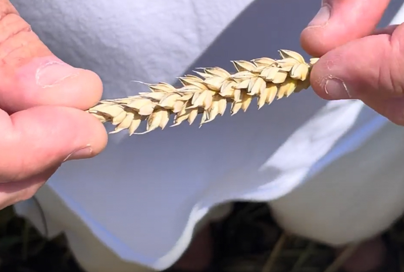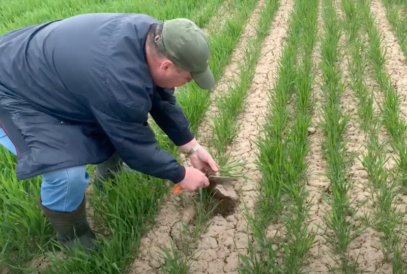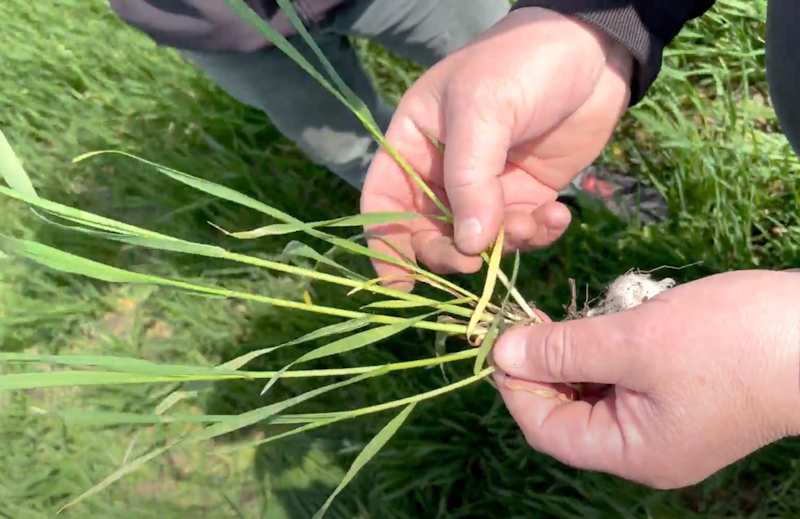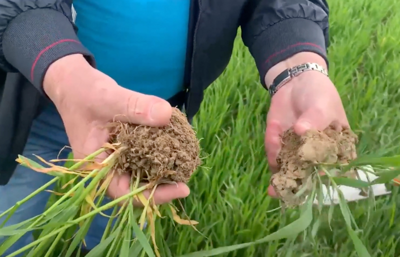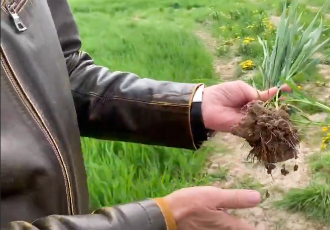 Звертаємо увагу на те, що вирвана пшениця повністю з корінням, має структуру. Це тому що повітря в ґрунті доходить до самого низу коріння. Воно ще тонке, але вже міцне – не обривається, виривається цілком. Це показник гарного стану ґрунту, і як наслідок – здорової рослини.
