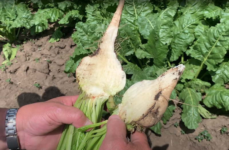 На фото нижче той самий буряк, агротерміни посіву якого були здвинуті на тиждень. Одразу виникає питання: скільки яких добрив було застосовано? Аграрій звітує: «Восени – 150 кг NPK у ф.в, в сівалку близько 90 кг NPK у ф.в; навесні – 100 кг карбаміду та 100 кг селітри».