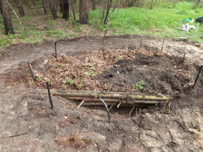 КРОК 4. На відстань 1,0-1, 2 м від краю вирви зняти шар грунту товщиною 5-7 см разом із усією органікою, яка там є, і скидати на дренажну основу поверх дерев’яної перегородки, додаючи всі складові (ЕМ-бокаші, леонардит, мікоризатор «Міковітал», біочар, цеоліт та інші інгредієнти для підвищення родючості). Органіки має бути більше, ніж ґрунту.