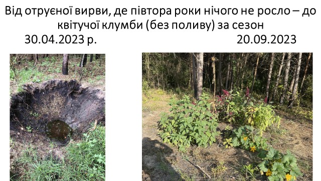 Валентина Мовчан повідомила, навесні цього року в селі Торф’яне Бородянського району була вирва, яку закидали органічною сумішшю із певними добавками і вона перетворюється в осередок родючості. Там було кілька прильотів, але одна вирва була абсолютно вільна від рослинності – за півтора року там нічого не виросло. Члени ГС «Пермакультура в Україні» та студенти освітньої програми «Конструктивна екологія та пермакультура» Університету «Україна» спільно із фахівцями «Інституту охорони ґрунтів» працювали над відновленням родючості отруєного ґрунту – і в результаті вдалось від вирви перейти до квітучої клумби за один сезон.