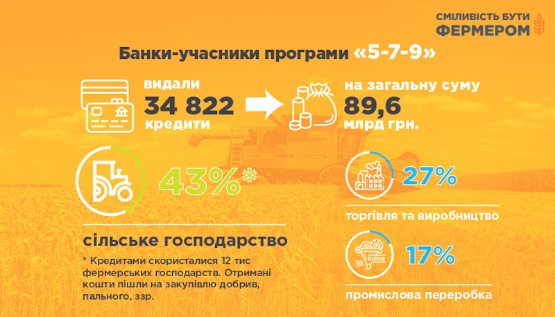 За інформацією Міністерства розвитку економіки, торгівлі та сільського господарства України, приблизно половина всіх кредитів припадала на сільське господарство. Фінансування оборотного капіталу, компенсація процентів на час обмежувальних заходів, збільшення строку кредиту та можливі поєднання з іншими програмами - стали перевагами "5-7-9”. Завдяки програмі, понад 200 тис. українців зберегли та отримали робочі місця.